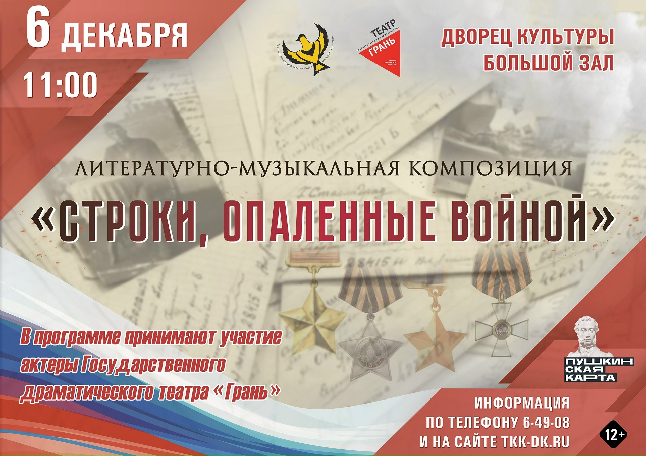 6 декабря в 11:00 во Дворце культуры состоится литературно-музыкальная композиция «Строки, опаленные войной». Мероприятие приурочено ко Дню Героев Отечества.