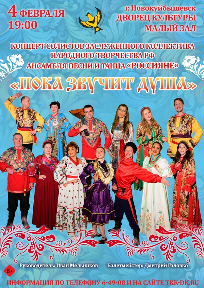 Заслуженный коллектив народного творчества РФ ансамбль песни и танца «Россияне» представляет концертную программу «Пока звучит душа». Это концерт, где мастерство, виртуозность и артистизм лучших исполнителей […] Читать Далее