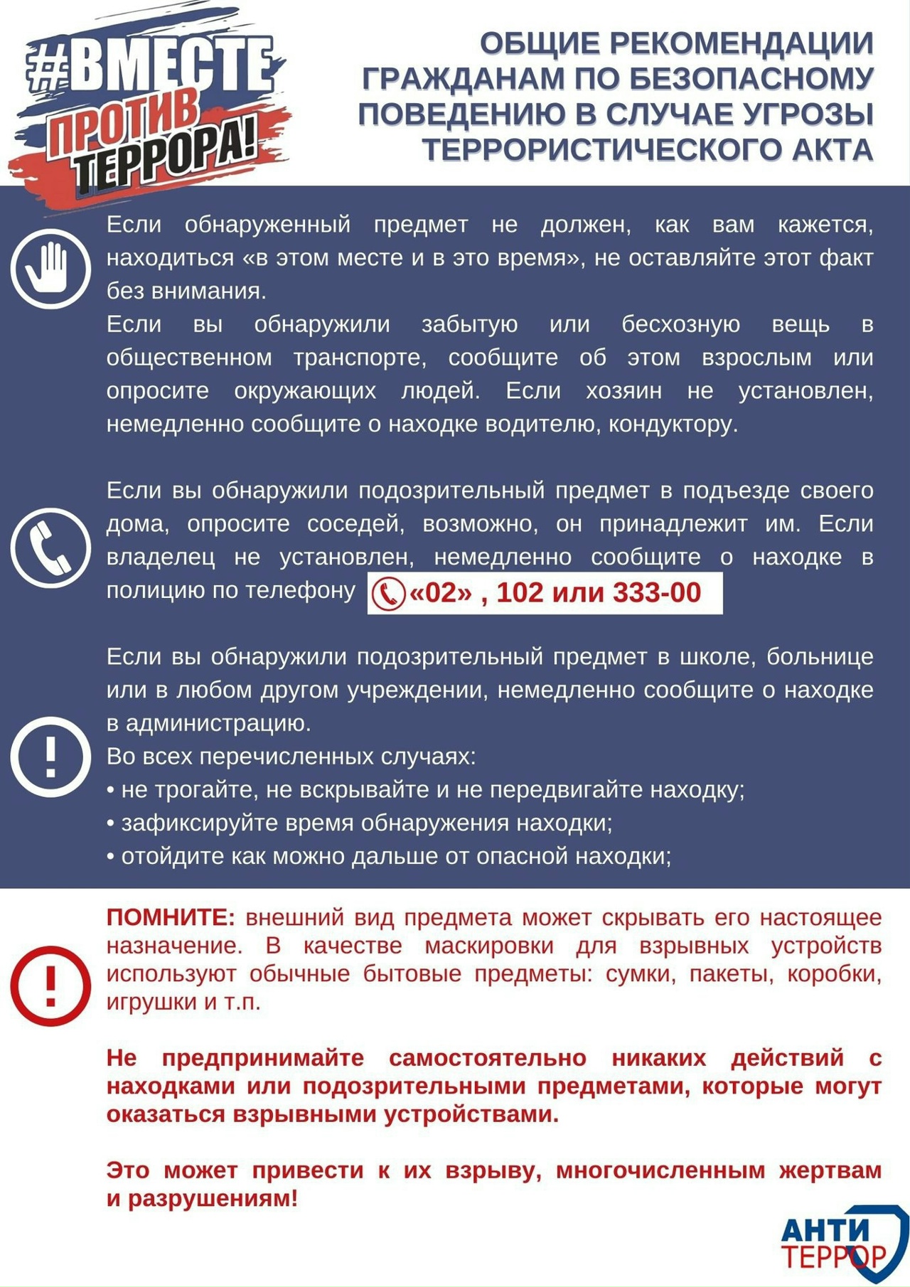 Не проходите мимо и не скрывайте информацию, если вы стали свидетелем подозрительных действий, странного поведения людей или получаете тревожные сообщения — нельзя умалчивать. Сообщите в компетентные службы.