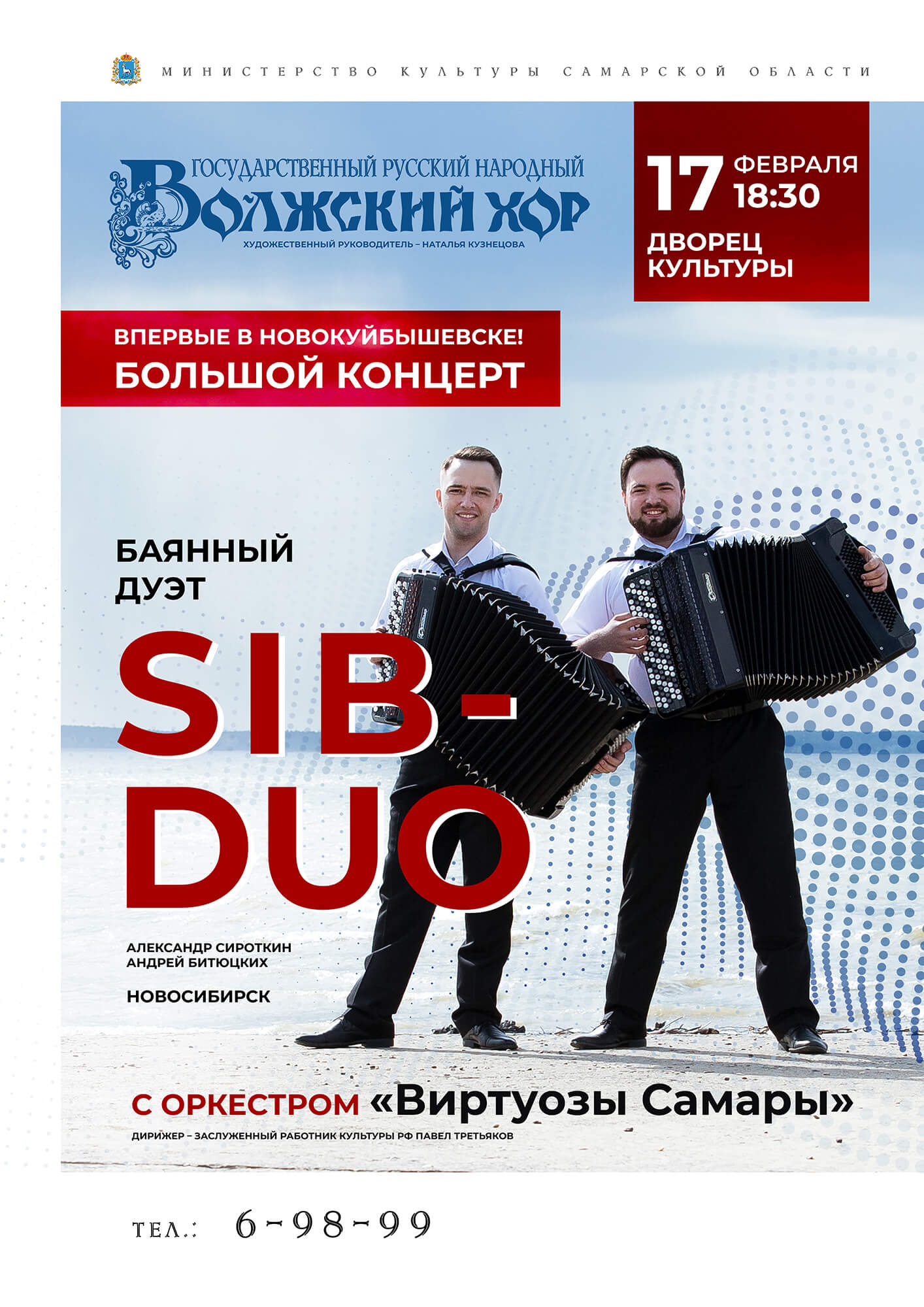 Впервые в Новокуйбышевске на одной сцене оркестр народных инструментов «Виртуозы Самары» и уникальный баянный дуэт «SIBDUO». 17 февраля в 18.3 состоится долгожданный совместный концерт двух коллективов: оркестра народных инструментов Государственного