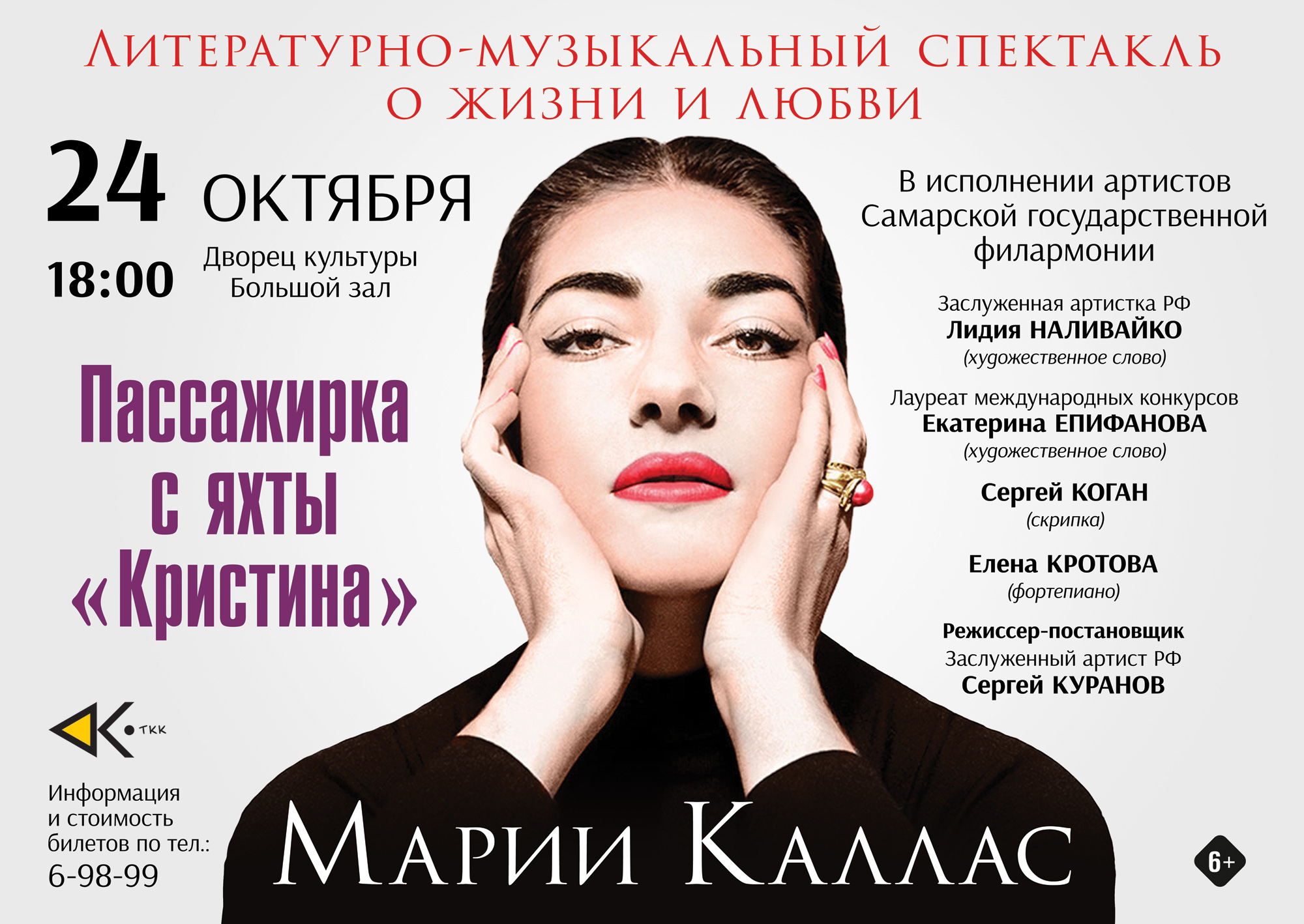 24 октября в 18.00 приглашаем на литературно-музыкальный спектакль о жизни и любви величайшей певицы ХХ века Марии Каллас «Пассажирка с яхты «Кристина» в исполнении артистов Самарской государственной филармонии.