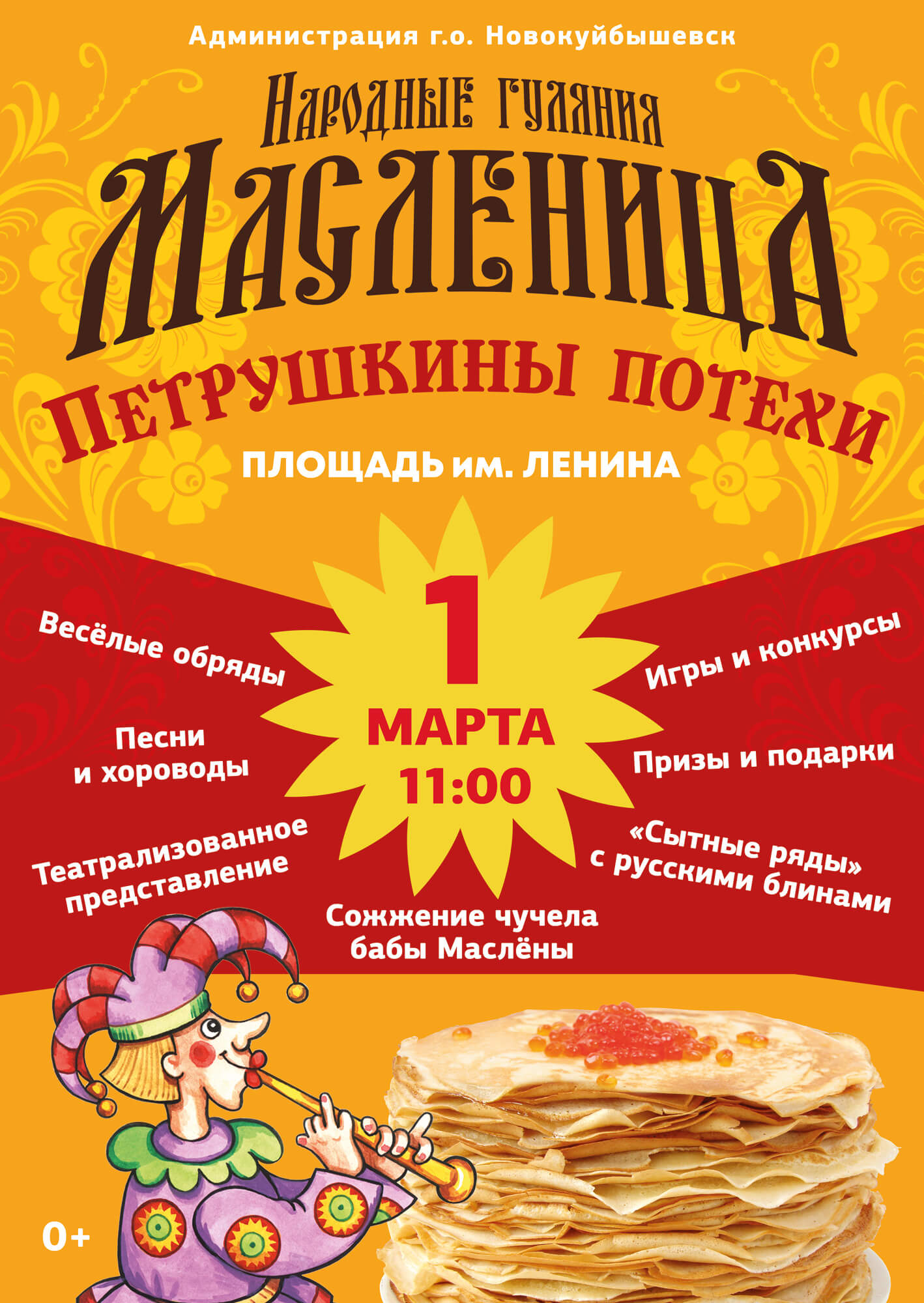 1 марта всех жителей города приглашаем на городскую площадь, где пройдут масленичные гуляния «Петрушкины потехи». Яркое театрализованное действо начнётся в 11.00 .