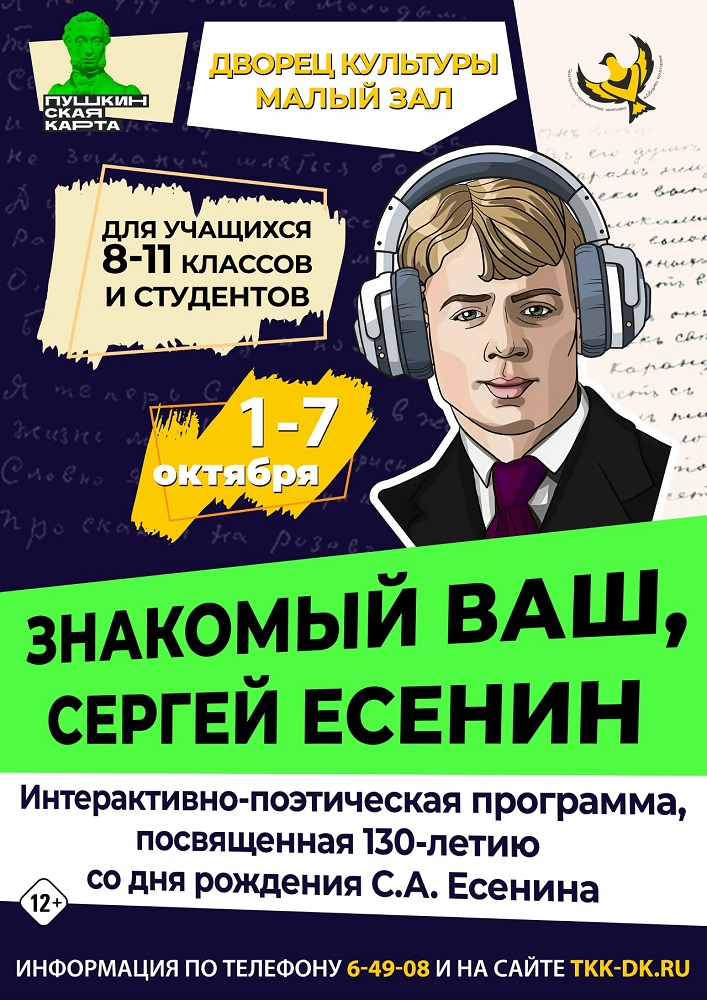 Со 2 по 7 октября в Малом зале Дворца культуры пройдет интерактивно-поэтическая программа «Знакомый ваш, Сергей Есенин», посвященная  130-летию со дня рождения поэта. Это мероприятие станет настоящим  путешествием в мир поэзии, где строки оживают, а классика говорит на языке современности.